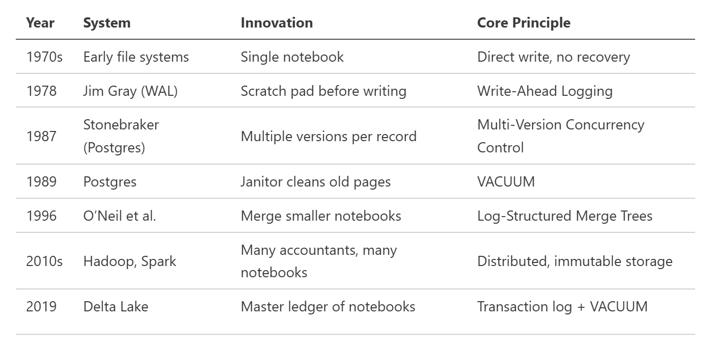 From Jim Gray’s log pad to Stonebraker’s multi-version pages, from the LSM filing cabinets to Delta’s digital ledger — each solved the same timeless problem: