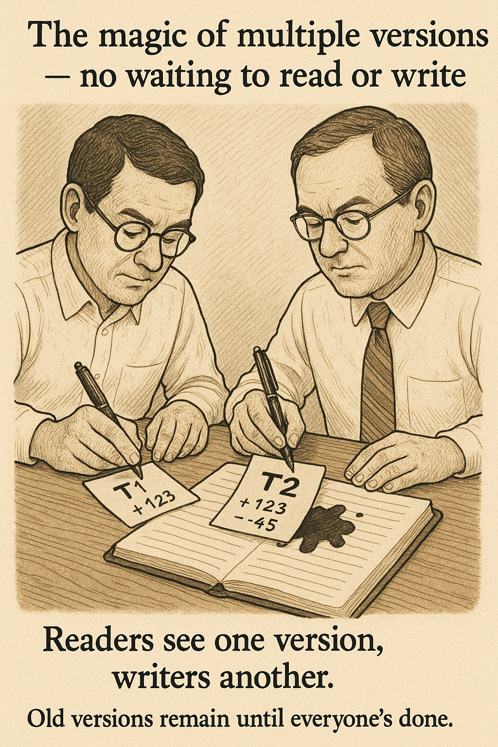 Now, instead of locking pages, each accountant worked on their own version of a record. Readers saw a consistent snapshot, while writers created a new one.