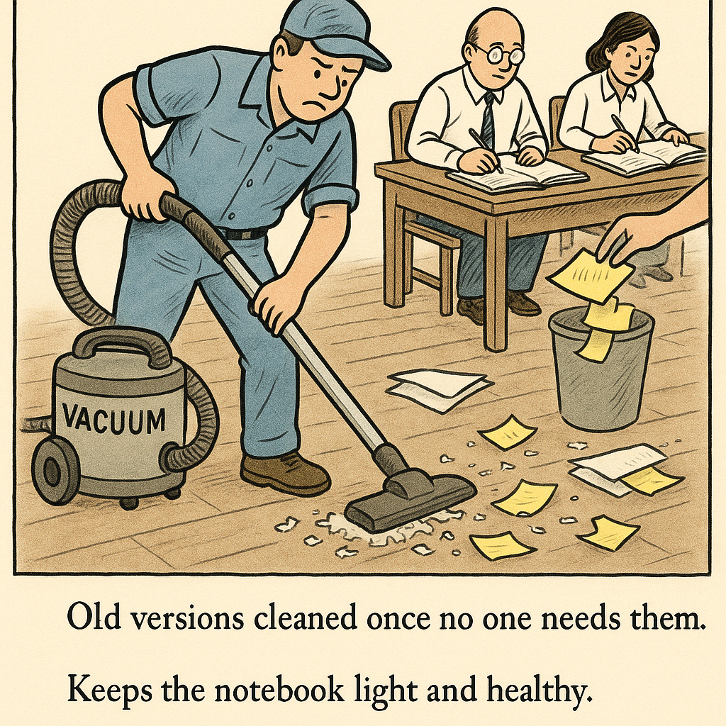 With so many versions floating around, notebooks started to bloat. Enter the janitor — the VACUUM process — whose job was to periodically tear out old, obsolete pages once no one was reading them.