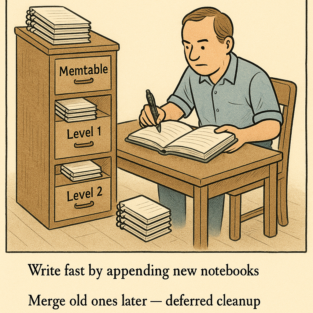 We learned to write fast by simply adding new notebooks — and merge them later in batches. That was the Log-Structured Merge Tree (LSM Tree) invented by Patrick O’Neil in 1996.