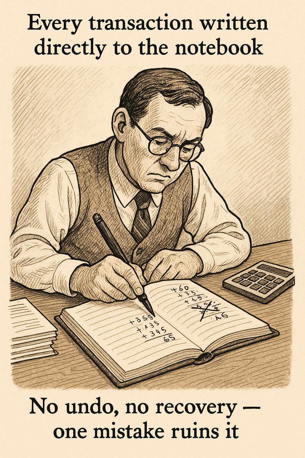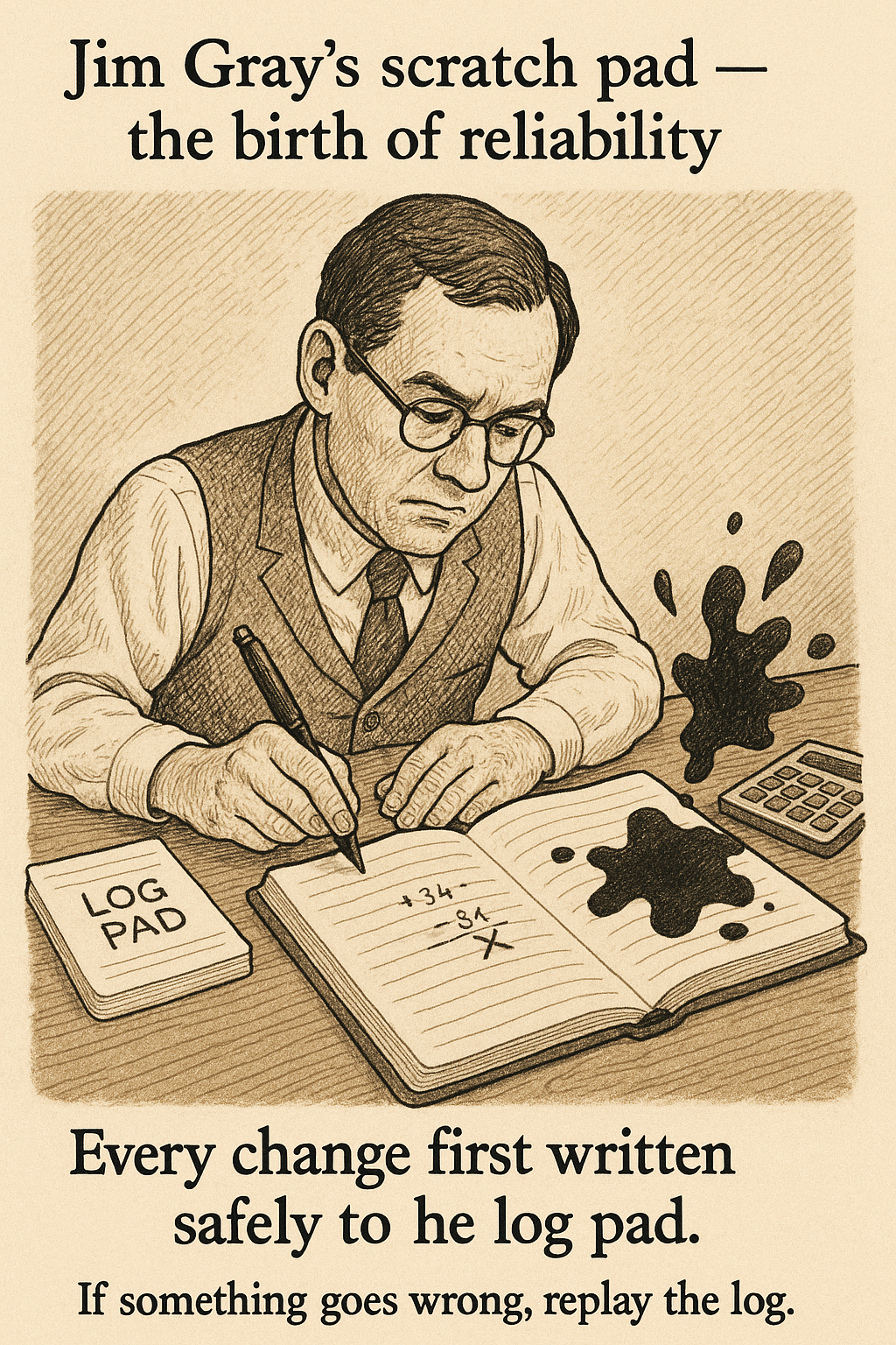 If you spill ink or crash mid-way, you can reconstruct everything from this pad. That principle became Write-Ahead Logging (WAL) — one of the cornerstones of the ACID guarantees that every modern database depends on.